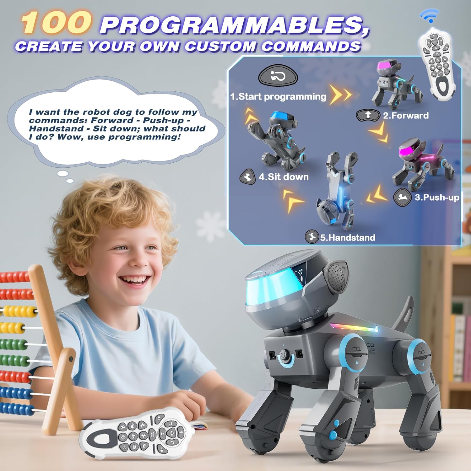 - 【100 Programmable Actions】100 customizable command sequences to unleash creativity! Children can freely create personalized routines like "sit → stand → sing → dance," and the robot dog precisely executes every programmed instruction, providing an unparalleled interactive experience. Children feel like they are talking to a real electronic pet, stimulating their logical thinking and creativity while having fun.