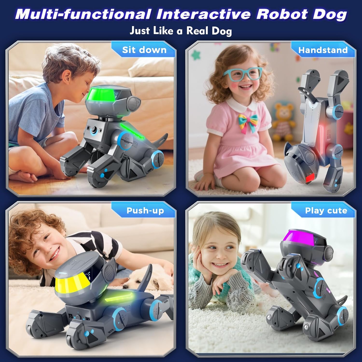 - 【Surprising Interactive Technology Gifts】This smart robot dog will definitely make your kids scream! Its futuristic, tech-inspired design and vibrant dynamic lights give it a tech-inspired feel the moment it's turned on. It can play music, program movements, and interact with you just like a real dog—obeying commands and acting cute. Whether it's a Birthday, Christmas, New Year, Thanksgiving, this tech-inspired, creative, and interactive robot dog is the excellent gift choice.